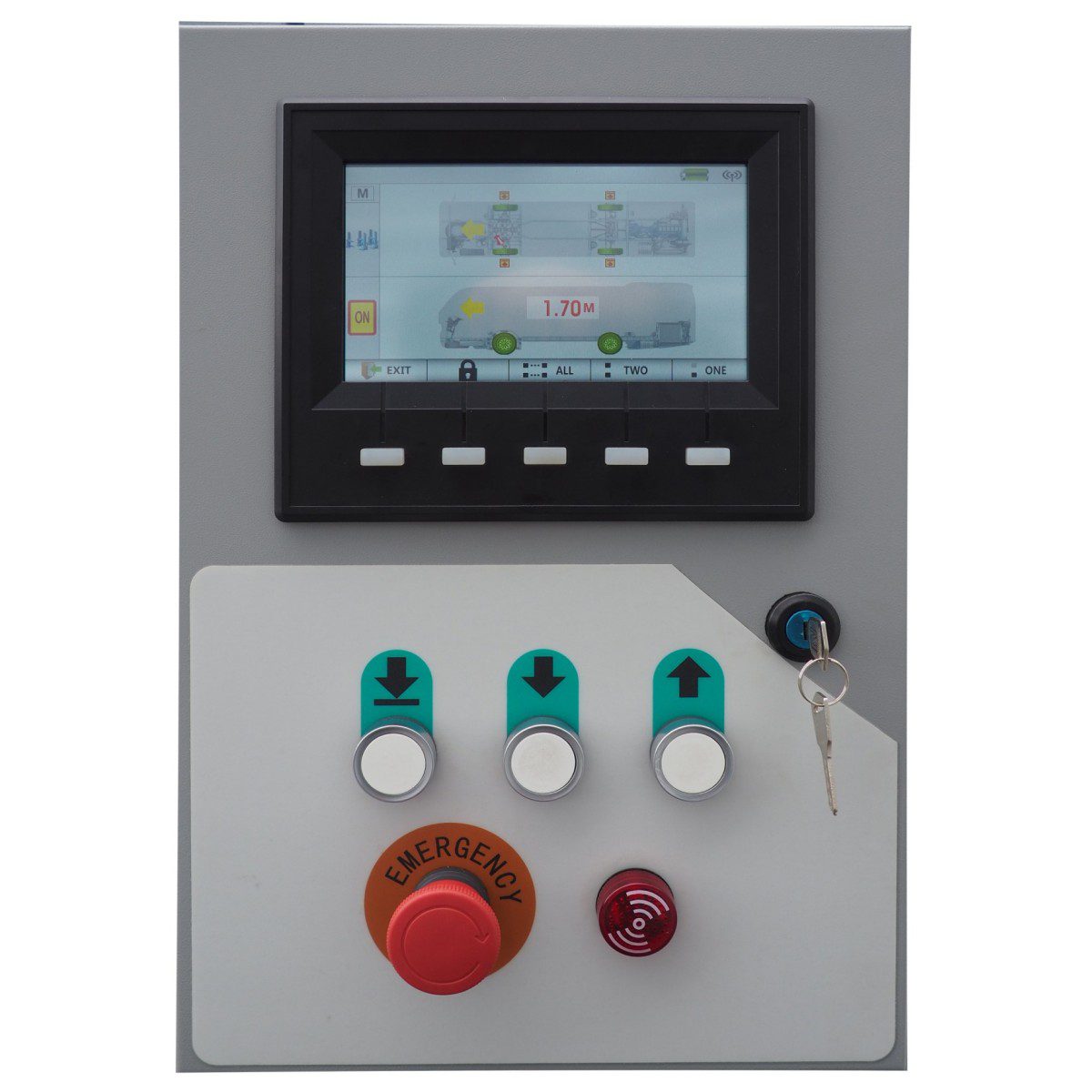 Kontrolpanel med softkeys og touchskærm LCD-farvedisplay på hver kolonne viser status for de forskellige funktioner i det mobile søjleløftesystem.
