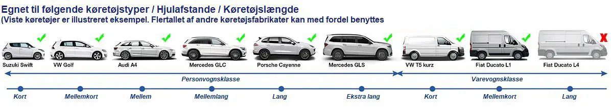 Designet til at løfte små og store personbiler og sportsvogne, SUV'er, varevogne, trailere, campingvogne og mindre busser i vægtklassen op til 4000 kg.