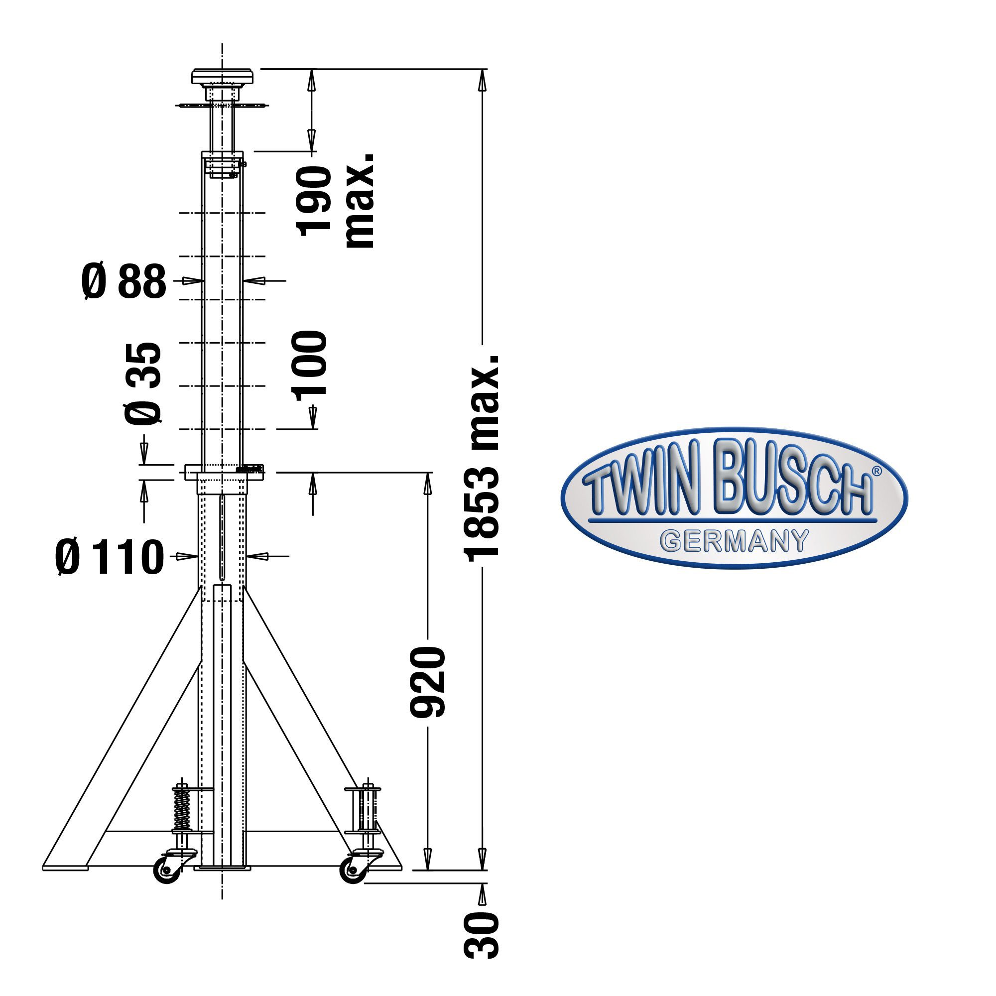 TwinBusch TW575-USB-G har en meget fleksibel højdejustering fra 1160 til 1800 mm, hvilket gør den anvendelig til mange forskellige køretøjstyper. De fjederbelastede hjul aktiveres automatisk, når belastningen fjernes, så bukken nemt kan flyttes rundt på værkstedet.